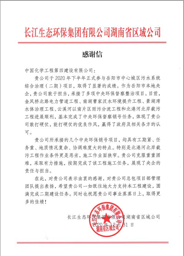1月1日,新年的第一天,公司岳陽中心城區污水項目部收到長江生態環保集團有限公司(湖南省區域公司)送來的感謝信。在信中,業主對公司岳陽污水項目部管理團隊提出表揚,對工程建設過程中面對工期緊、任務重、地質情況復雜、協調難度大等諸多困難,特別對建筑片區施工的北港河北岸截污工程克服重重困難、采取有力措施按期完成工程施工任務表示肯定,稱贊公司敢于擔當、能打硬仗,展現了央企的責任與擔當!業主對公司各級領導表示衷心的感謝和誠摯的節日問候,希望公司一如既往地支持工程建設,圓滿完成岳陽市中心城區污水二期建設任務。