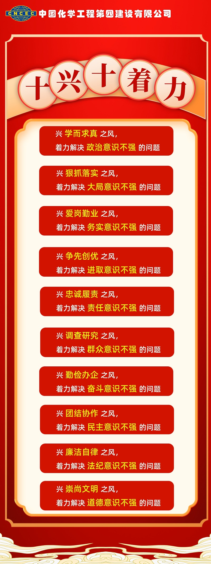 活動通知中針對公司職工在工作中存在的思想、責任、作風三個“不在線”問題,明確了作風建設重點治理的總體目標,以支部為單位,組織開展“能力作風建設”大討論,努力實現“十興十著力”目標。從今天起,公司將對“十興十著力”目標進行深入解讀。