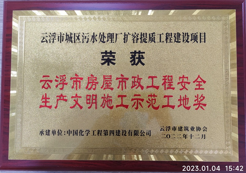 1月4日,由華南公司承建的云浮市城區污水處理廠擴容提質工程項目獲評2022年云浮市房屋市政工程安全生產文明施工示范工地。