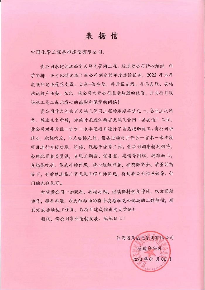 元月7日,江西省天然氣集團有限公司管道分公司給華北公司發來表揚信,對華北公司安全優質高效完成江西省天然氣管網工程年度建設任務表示感謝。
