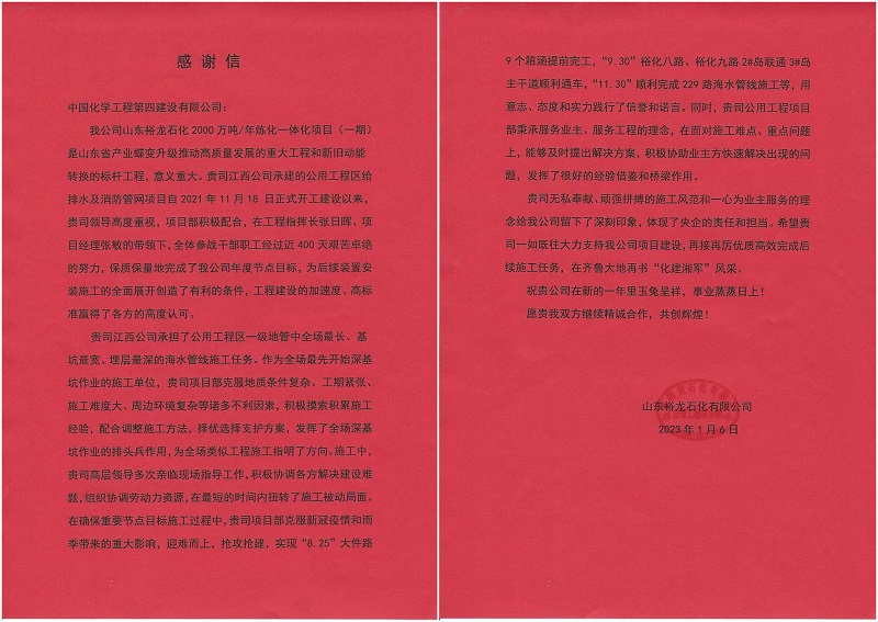 新年伊始,江西公司收到山東裕龍石化有限公司的《感謝信》,感謝江西公司在承建的山東裕龍石化公用工程區給排水及消防管網項目中,保質保量完成了業主的年度節點目標,為后續裝置安裝施工的全面展開創造了有利的條件,工程建設的加速度、高標準贏得了各方的高度認可,公司無私奉獻、頑強拼搏的施工風范和一心為業主服務的理念,體現了央企的責任和擔當。
